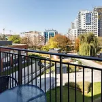 ベッドルーム1室のClose-Urban Chic - Cozy And Modern Apartment- Jana Pawla ヴロツワフはKolejkowoとPasażNiepolda alleyから歩いてわずか6分に位置し、庭園の景色を望めます。 ビジネスとレジャーの両方でWiFiを利用することができます。